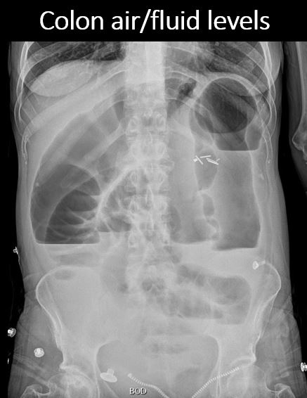There are air/fluid levels in the colon. |