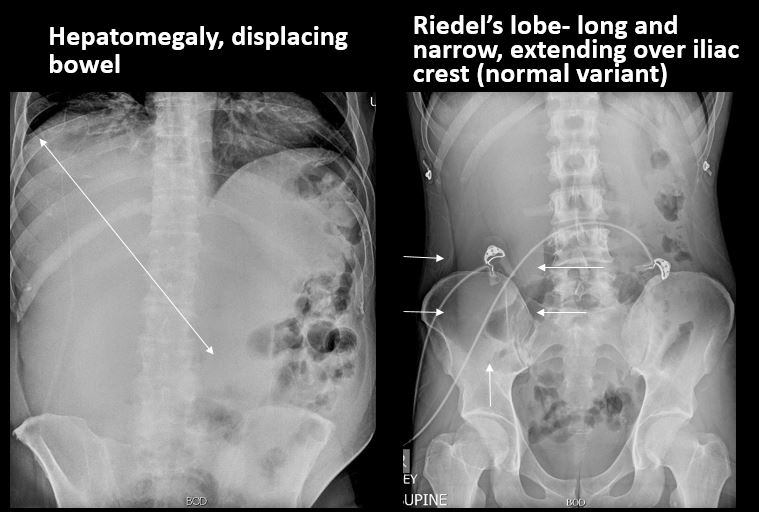 There is hepatomegaly or a prominent right lobe (Riedel's lobe) of the liver. |