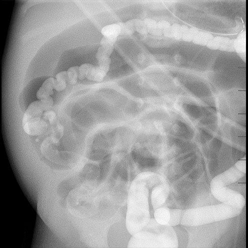 The patient evacuated contrast completely and a post-evacuation overhead radiograph was obtained.