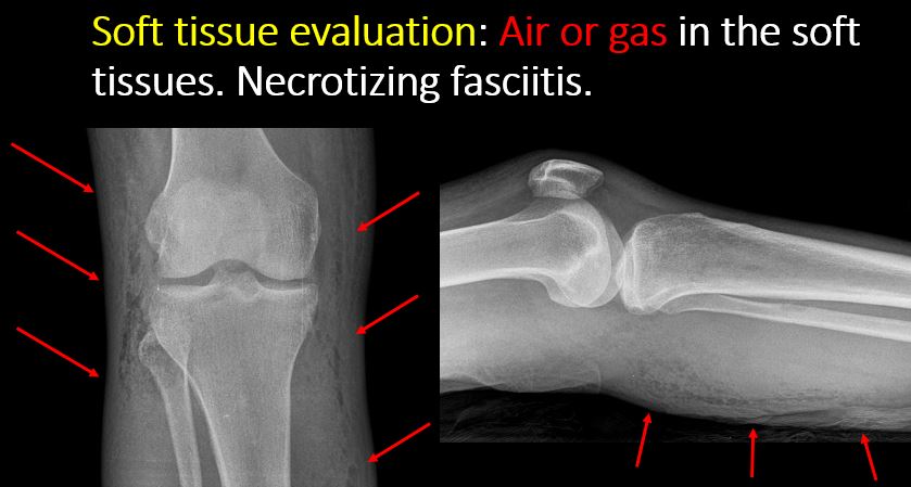 There is soft tissue swelling, indistinctness of fat/muscle planes, gas, or laceration in the area of clinical concern. |