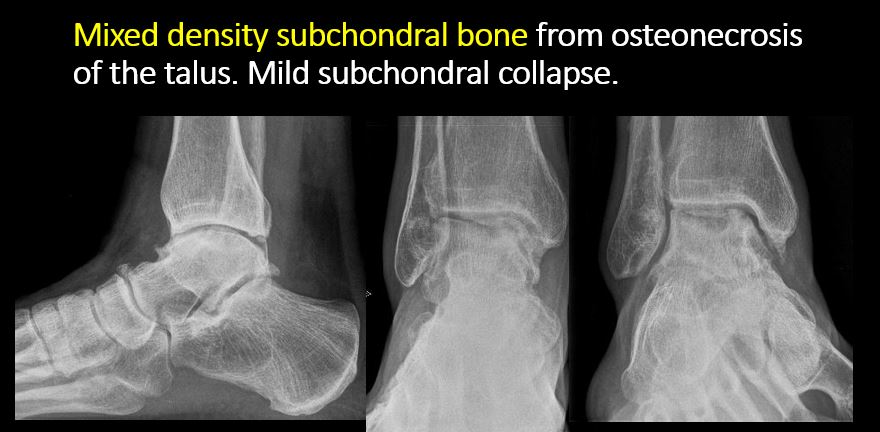 There is subchondral abnormality (lucencies, increased density, erosion) with or without cortical disruption or thickening which may be from osteonecrosis, osteochondritis dissecans, osteochondral fracture, inflammation, infection, or other abnormality. |