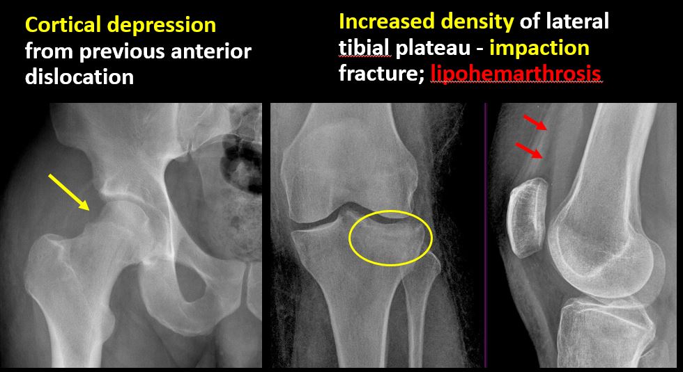 There is an impaction fracture of the medial posterior tibial plateau with a lipohemarthrosis. There is also an avulsion fracture of the lateral femoral epicondyle.