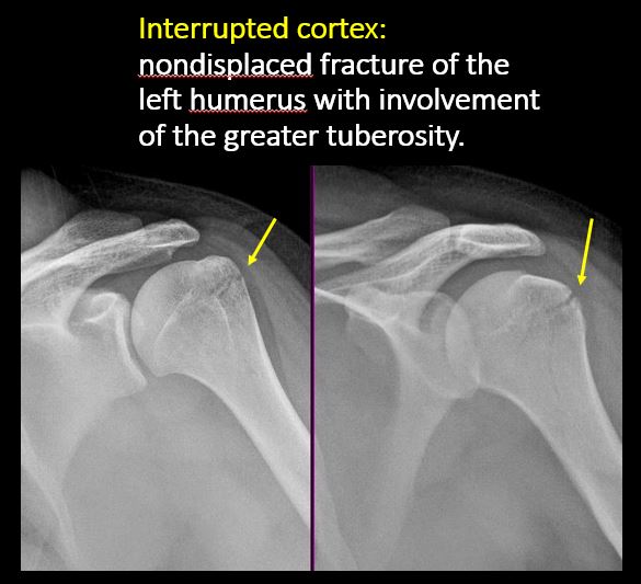 There is linear or irregular lucency, or increased density, cortical depression, flattening, or collapse with or without cortical disruption or thickening, which may be from a compression or impaction fracture, stress or insufficiency fracture, osteonecrosis, or other fracture. |