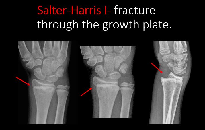 There is widening of the physis from a fracture with or without displacement of the epiphysis (Salter-Harris I).