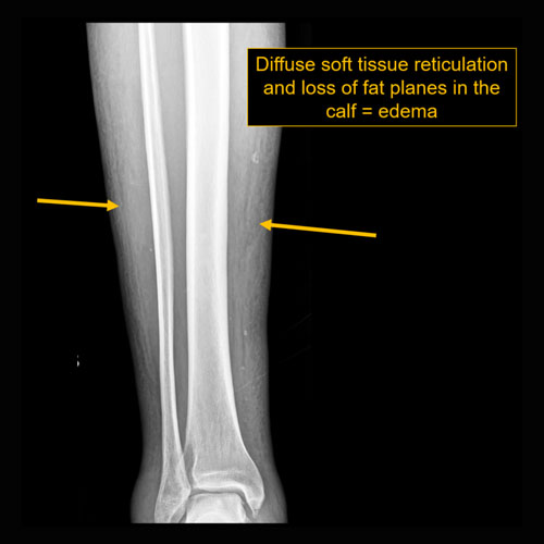 Mild soft tissue edema along the proximal lateral calf. No radiographic evidence for underlying acute osseous abnormality.