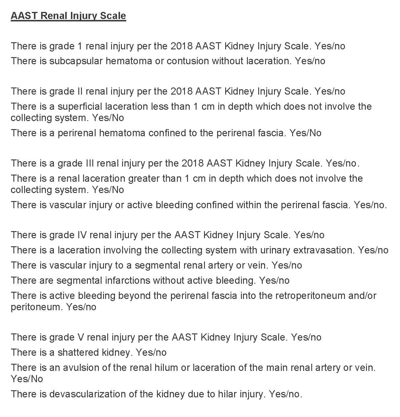 Section 1 Submit Findings CB1514 Findings FINDINGS The technique is suboptimal - motion artifact, inaccurate contrast bolus, metallic artifact, etc. Yes No MEDIASTINAL WINDOWS The thyroid is enlarged. Yes No There are focal lesions in the thyroid gland. Yes No There is aortic arch and branching abnormality. Yes No There is dissection of the aorta. Yes No The heart is enlarged. Yes No There is evidence of heart rupture. Yes No There is cardiac aneurysm. Yes No There is pleural or pericardial effusion. Yes No There is mediastinal, hilar, or axillary adenopathy. Yes No There is a small volume of residual thymic tissue which enhances homogenously. Yes No There is mediastinal hematoma. Yes No There is evidence of penetrating injury. Yes No LUNG WINDOWS There is focal air space opacity. Yes No There is focal lucency in the lung to suggest laceration. Yes No There are signs of aspiration. Yes No The trachea/bronchi are small/large in caliber. Yes No There is intraluminal filling defect bronchus/trachea/segmental bronchi. Yes No There is pneumothorax/pneumomediastinum. Yes No There is subcutaneous emphysema. Yes No There are lung nodules/masses. Yes No BONE WINDOWS There are fractures. Yes No There are lytic/blastic lesions. Yes No LIVER INJURY SCALE There is a grade I - V liver injury per the 2018 AAST Liver Injury Scale. Yes No HEPATOBILIARY There are focal hepatic lesions-laceration/hematoma in the left lobe/right lobe. Yes No There is soft tissue/hematoma in the liver hilum/porta. Yes No There is periportal hypodensity. Yes No There is intrahepatic biliary ductal dilatation. Yes No The CBD is dilated. Yes No There is pseudoaneurysm in the liver. Yes No There is subcapsular hematoma. Yes No There is arterial blush in the liver parenchyma. Yes No There is contrast extravasation on the delayed images. Yes No Gallbladder is distended. Yes No There is fluid in the gallbladder fossa. Yes No PANCREATIC INJURY SCALE There is a grade I - V pancreatic injury per the 2018 AAST Pancreatic Injury Scale. Yes No PANCREAS There is hypodensity/hematoma in the pancreas. Yes No There is fluid/hemorrhage in the lesser sac. Yes No The pancreatic duct is dilated. Yes No There is heterogenous fluid collection/collection with fluid fluid level in the pancreas. Yes No There is peripancreatic collection. Yes No There is pancreatic transection/laceration. Yes No The peripancreatic fat shows infiltration. Yes No The pancreas is enlarged/small. Yes No The pancreas is hyperenhancing. Yes No SPLEEN INJURY SCALE There is a grade I - V spleen injury per the 2018 AAST Spleen Injury Scale. Yes No SPLEEN The spleen is enlarged. Yes No There is focal lesion (contusion/hematoma/laceration) in spleen. Yes No There is pseudoaneurysm in the spleen. Yes No There is subcapsular hematoma. Yes No There is arterial blush in the splenic parenchyma. Yes No There is contrast extravasation on the delayed images. Yes No There is decreased perfusion to the spleen. Yes No ADRENALS The adrenal gland is enlarged (right or left). Yes No There is hypodense mass in the adrenal gland. Yes No The adrenal glands are hyperenhancing. Yes No RENAL INJURY SCALE There is a grade I - V renal injury per the 2018 AAST Renal Injury Scale. Yes No KIDNEYS/URETERS There is renal contusion/laceration/hematoma. Yes No There is subcapsular hematoma. Yes No There is retroperitoneal/perinephric collection. Yes No There is arterial/venous extravasation in renal parenchyma. Yes No There is vascular injury (vascular disruption/thrombosis). Yes No On delayed imaging, there is contrast extravasation from the collecting system. Yes No N/A The perfusion to the kidneys is increased/decreased. Yes No There is persistent ureteral enhancement. Yes No N/A PELVIC ORGANS/BLADDER There are focal lesions in the ovaries/uterus/prostate. Yes No The urinary bladder is collapsed. Yes No There is contrast extravasation from the bladder into the soft tissues on delayed imaging. Yes No There is contrast extravasation from the bladder into the peritoneal space on the delayed images. Yes No There is a filling defect in the bladder. Yes No The bladder was is thickened. Yes No PERITONEUM There is free fluid/hemorrhage in the peritoneum. Yes No There is free/loculated air. Yes No LYMPH NODES There is intraabdominal/retroperitoneal/mesenteric/pelvic adenopathy. Yes No VESSELS There is dissection of aorta. Yes No There is active extravasation of contrast from aorta. Yes No Aorta is small in size. Yes No IVC is small in caliber. Yes No IVC is hyper enhancing. Yes No There is hypodensity around the IVC. Yes No GI TRACT There is focal wall thickening/hematoma/intramural hematoma-duodenum/jejunum. Yes No There is bowel obstruction. Yes No There is focal mesenteric stranding/hematoma. Yes No There is bowel perforation. Yes No There is leakage of oral contrast. Yes No There is focal ileus. Yes No There is focal decreased bowel enhancement. Yes No There is diffuse bowel wall thickening. Yes No There is diffuse bowel wall enhancement. Yes No SOFT TISSUES There are foreign bodies. Yes No There is laceration of the soft tissue. Yes No There is anterior abdominal wall contusion/seat belt sign. Yes No