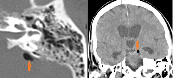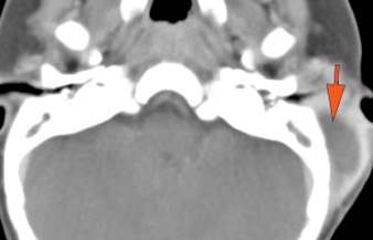 18-year-old female presenting to the emergency room with severe right-sided headache, mastoid region tenderness and swelling and fever, dizziness and possible meningitis. Study is done to look for evidence of coalescent or otherwise complicated mastoiditis as a cause for these symptoms.Exam
