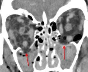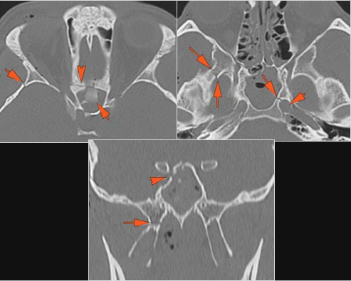 The soft tissues of the orbital apex and the superior and inferior orbital fissures appear abnormal. |