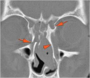 There is injury of the ethmoid complex. Specifically, the ethmoid roof, olfactory fossa and the cribriform plate are fractured and/or significantly dehiscent. |
