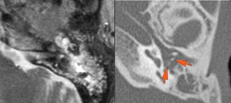 CT: Noncontrast (preferably) or CE CT of the maxillofacial region was obtained with 0.5-1.0 mm thick sections in the axial plane and reformatted 3D and/or in the coronal and sagittal planes and viewed interactively in 3 dimensions at the computer work station.