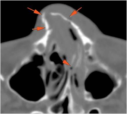The frontal bone and frontal sinus inner and outer tables are fractured. |