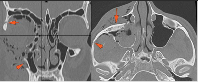 The the zygomatic arch, frontozygomatic suture or infraorbital rim are fractured. |