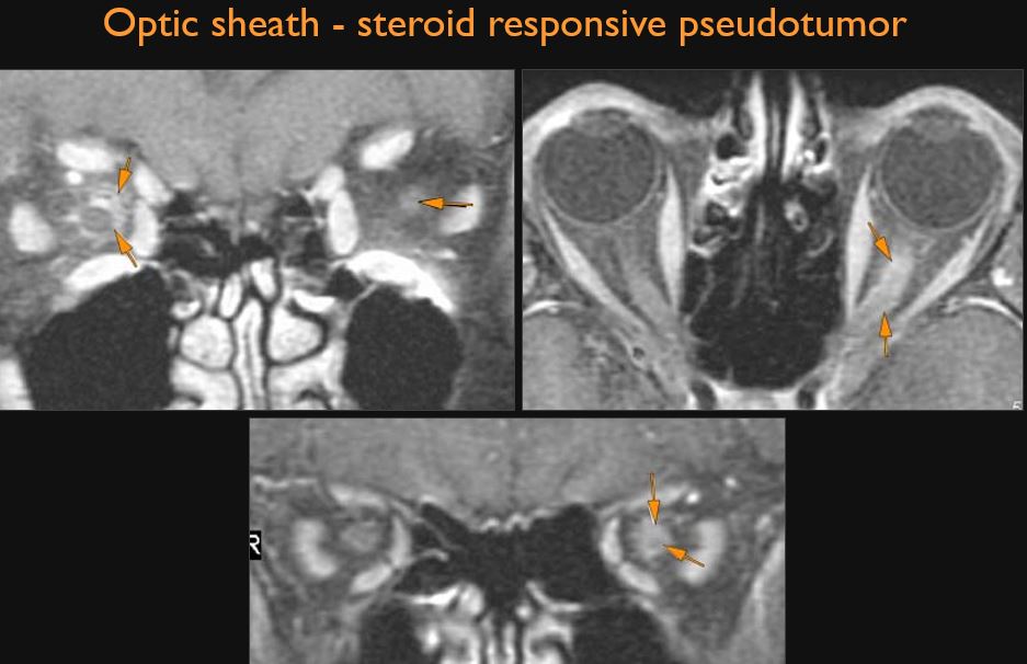 There is a structural abnormality or infiltrating process (especially around the optic sheath) of the intraconal compartment of the orbit.