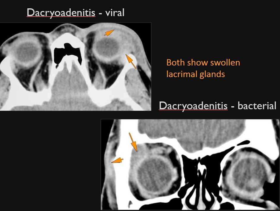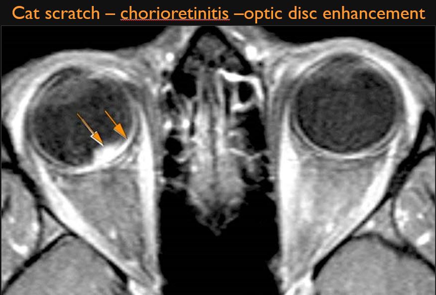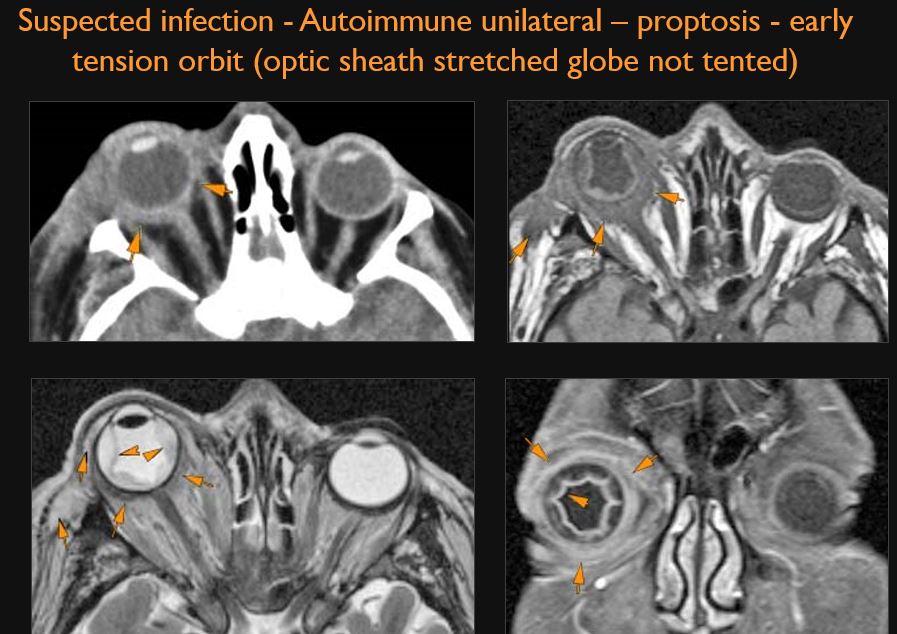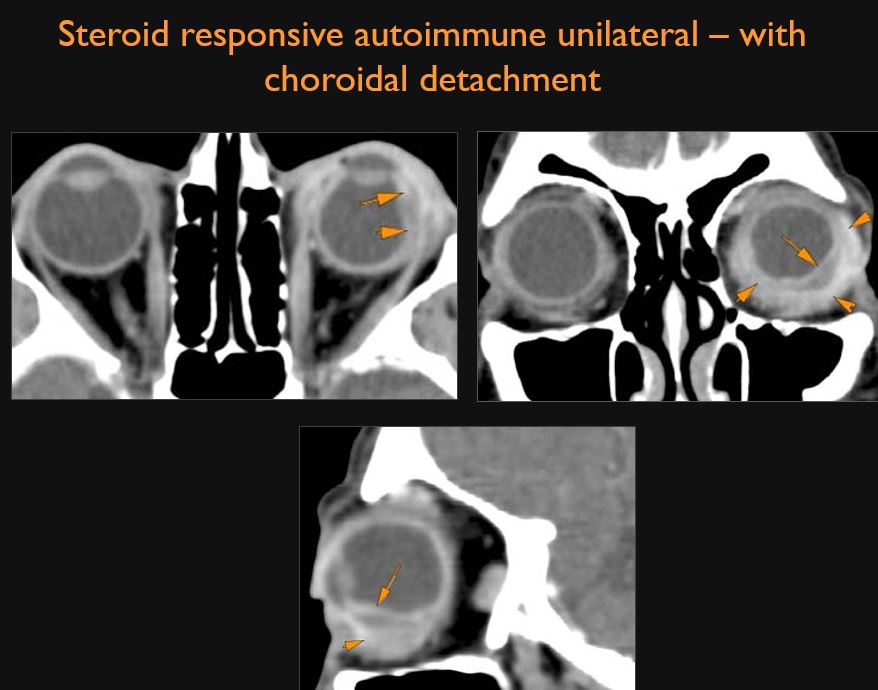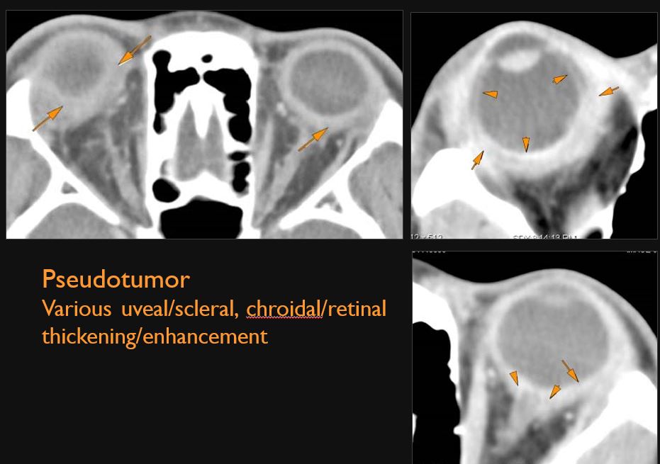 The uveal and scleral components of the globe are swollen or enhancing abnormally.