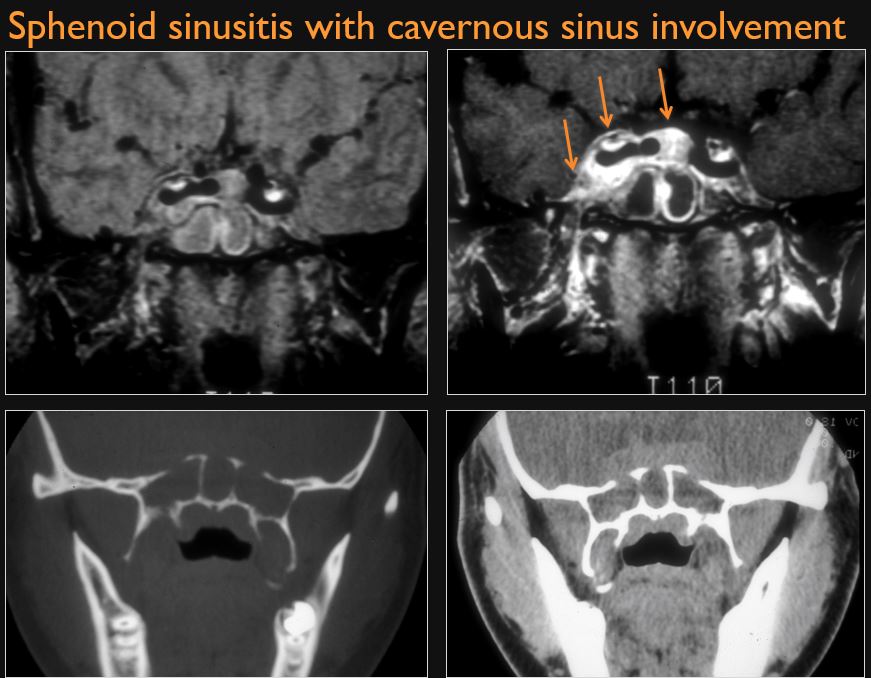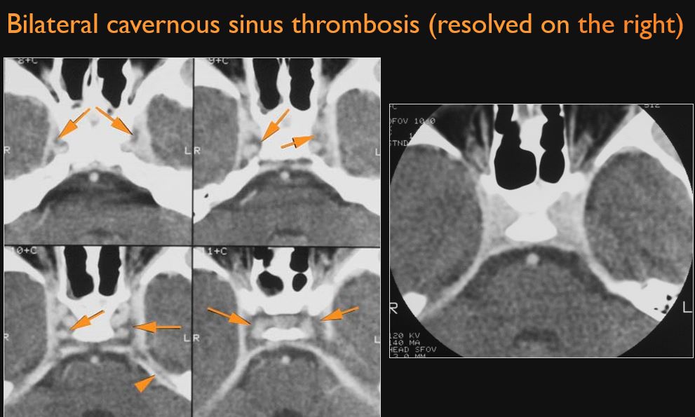 There is evidence of cavernous sinus thrombosis and/or inflammatory morphologic features in the cavernous sinus or para-cavernous region.