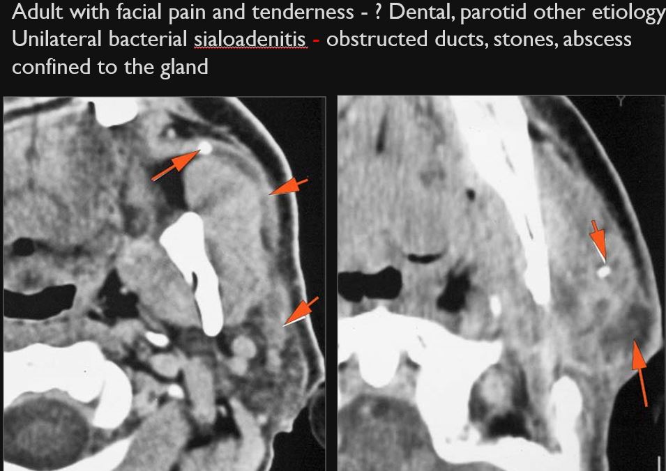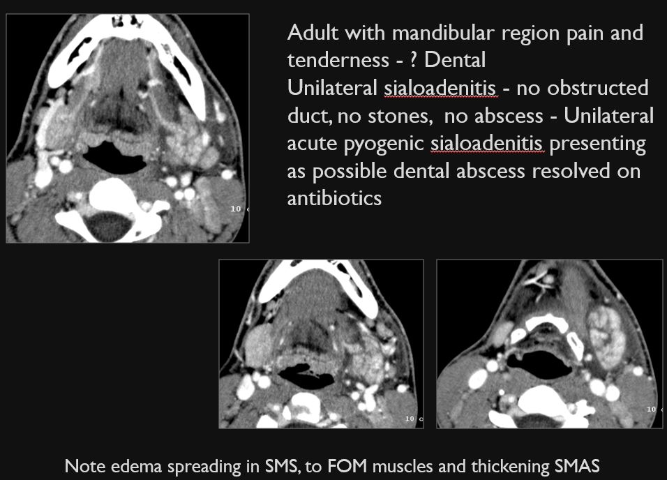 29 year old female in the emergency room with severe facial swelling with question of facial and/or neck abscess or uncertain etiology. Possible dental or salivary gland infection.Exam
