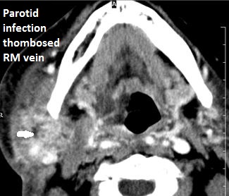 Contrast-enhanced CT of the maxillofacial region and neck and related anatomy with images obtained in the balanced or venous vascular phase to ensure optimal visualization of both arterial and venous structures as well as possible reactive changes around infected collections. 0.5-3.0 mm thick sections were obtained in the axial plane and reformatted 3D and/or in the coronal and sagittal planes and viewed inter actively in 3 dimensions at the computer work station.
