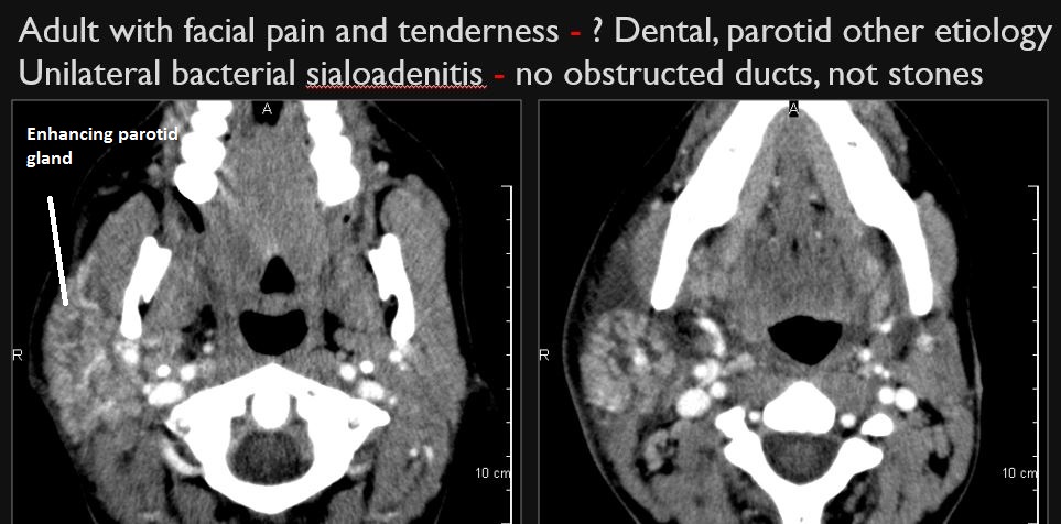 29 year old female in the emergency room with severe facial swelling with question of facial and/or neck abscess or uncertain etiology. Possible dental or salivary gland infection.Exam