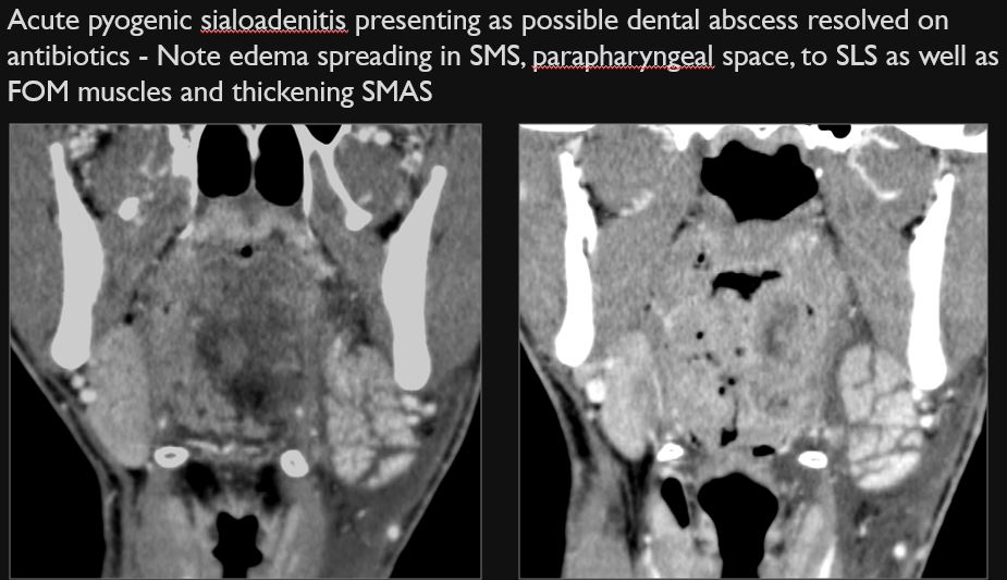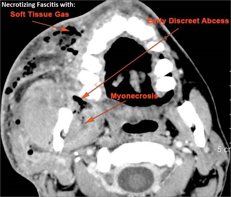 Contrast-enhanced CT of the maxillofacial region and neck and related anatomy with images obtained in the balanced or venous vascular phase to ensure optimal visualization of both arterial and venous structures as well as possible reactive changes around infected collections. 0.5-3.0 mm thick sections were obtained in the axial plane and reformatted 3D and/or in the coronal and sagittal planes and viewed inter actively in 3 dimensions at the computer work station.