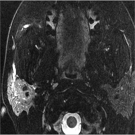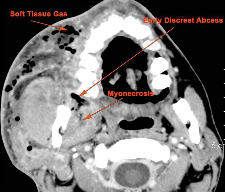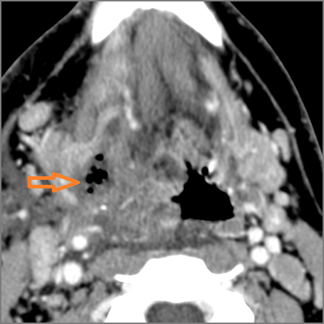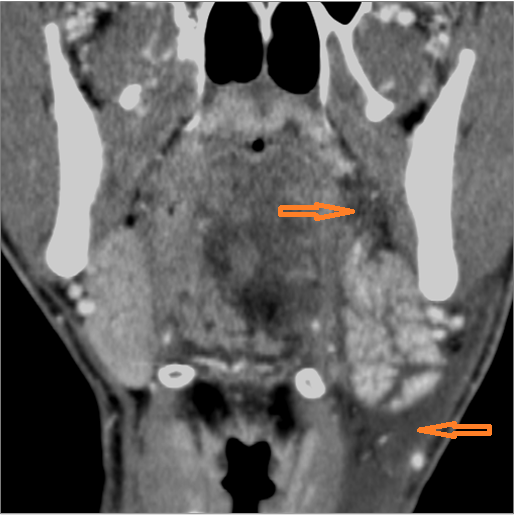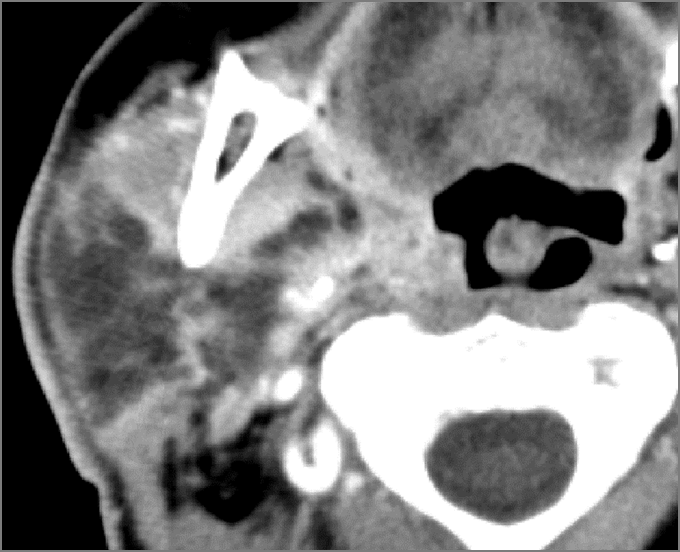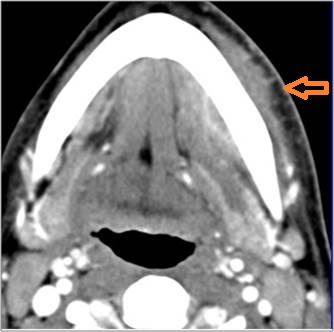 There is excessive enhancement or thickening of the fat or other soft tissues within or surrounding the buccal space, masticator space, floor of the mouth, submandibular space or the adjacent superficial fascia or subcutaneous fat and skin. |