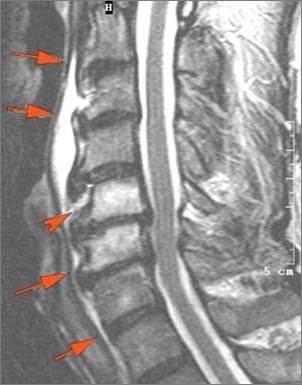 There is edema/abscess within in the prevertebral or paravertebral spaces. |