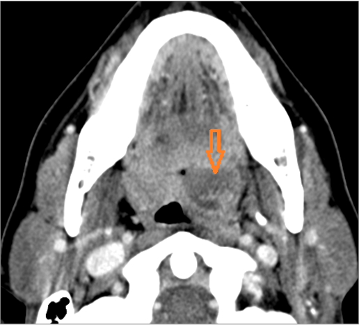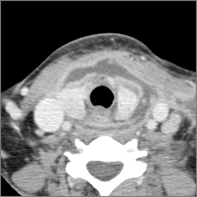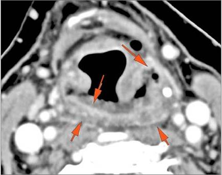 There is excessive enhancement or thickening of the mucosa within in the hypopharynx, larynx or trachea. |
