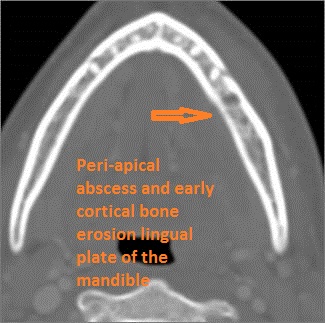 There is subperiosteal abscess or an abscess cavity adjacent to or involving the maxilla or mandible. |