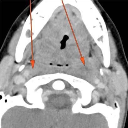 There is edema or abscess within the sublingual or submandibular space. |