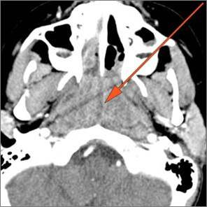 There is excessive enhancement or thickening of the mucosa or hypertrophy of the lymphoid tissue in the nasopharynx. |