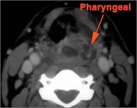 There is edema/abscess within the fat of the adjacent parapharyngeal and retropharyngeal spaces. |