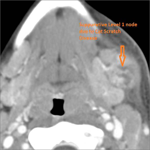 If there is suppurative cervical adenopathy the purulent material outside the lymph node(s) capsule(s). |