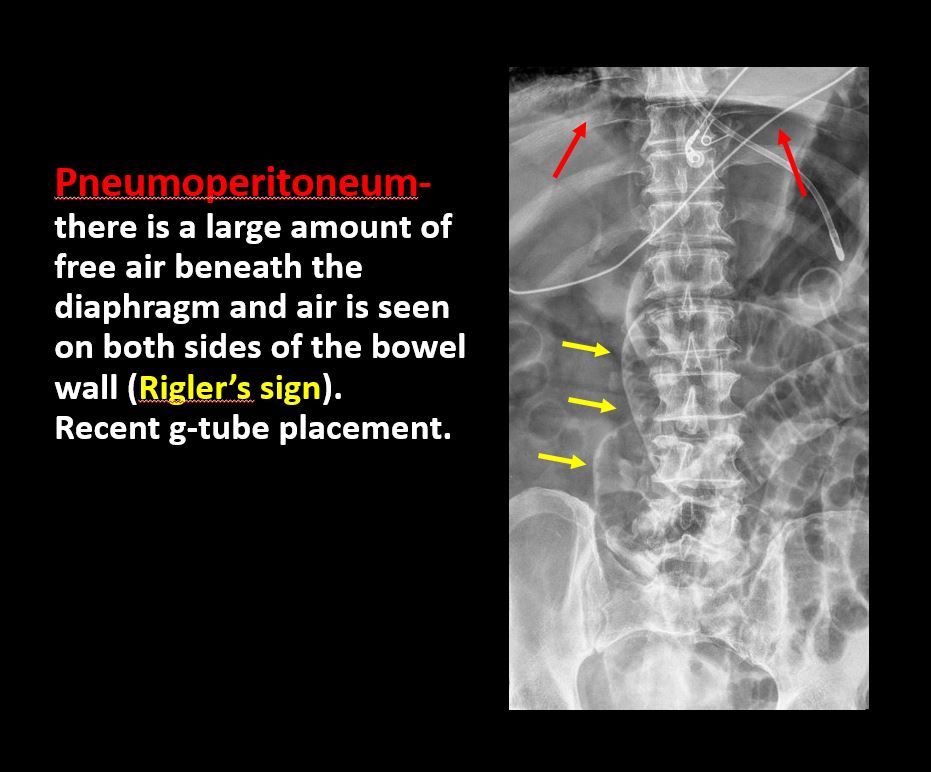 There is free intraperitoneal or retroperitoneal air or other abnormal air in the included chest, abdomen, or pelvis. |
