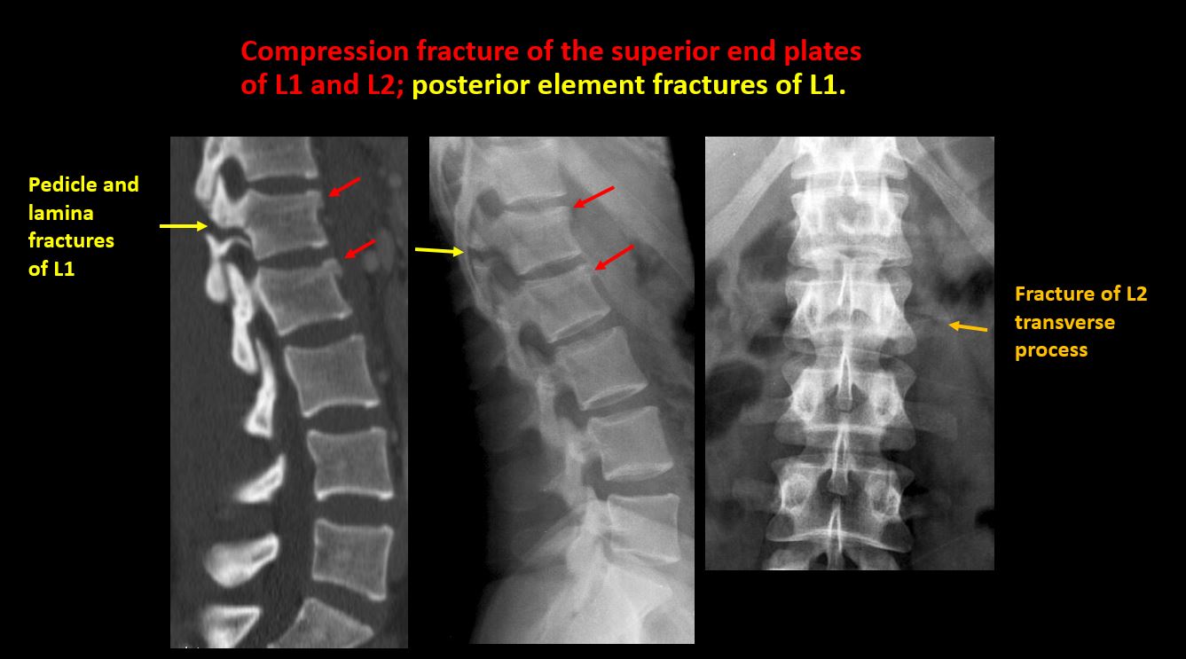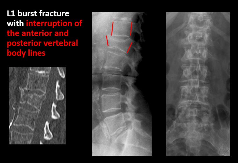 There is a fracture or distraction of a vertebral body, transverse or spinous process, or other posterior element. |