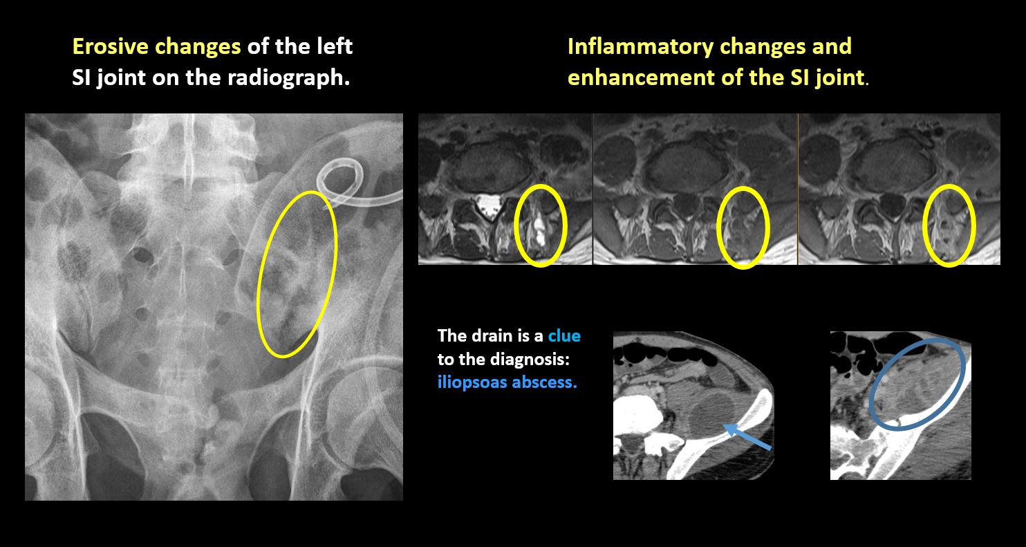 There is erosion, sclerosis, narrowing, or other abnormality of a sacral foramen or the SI joints. |