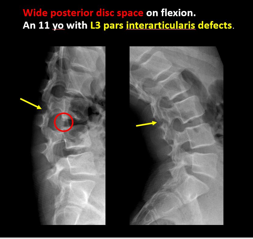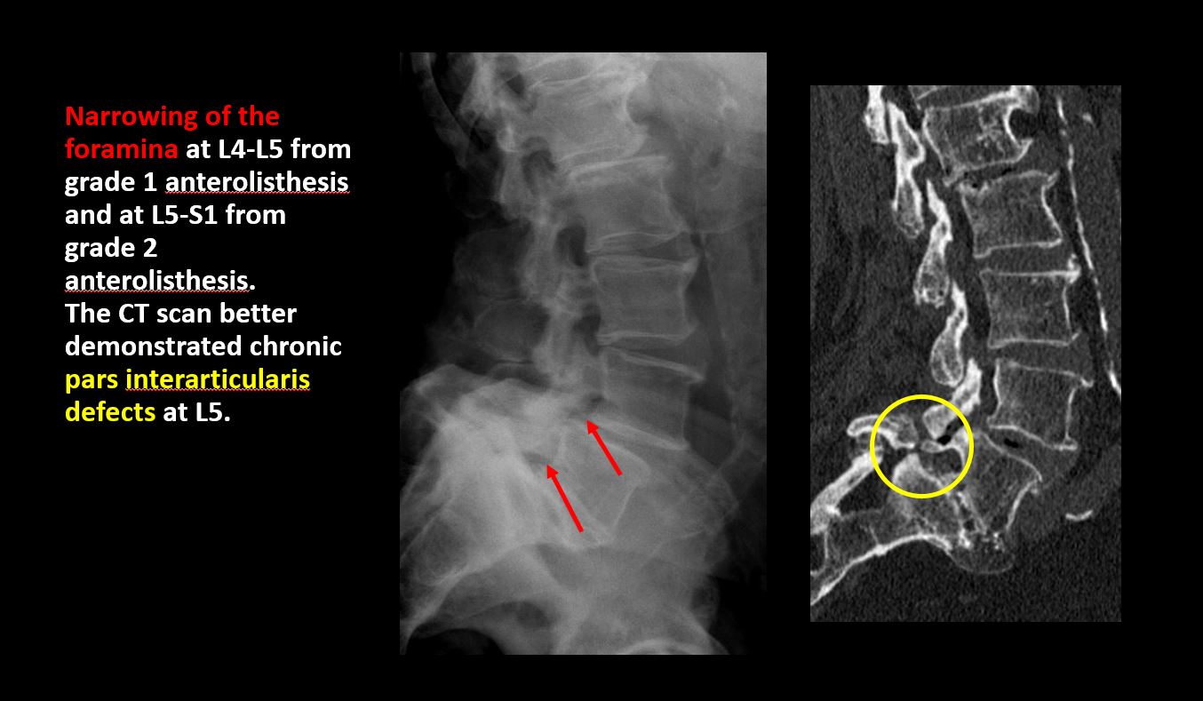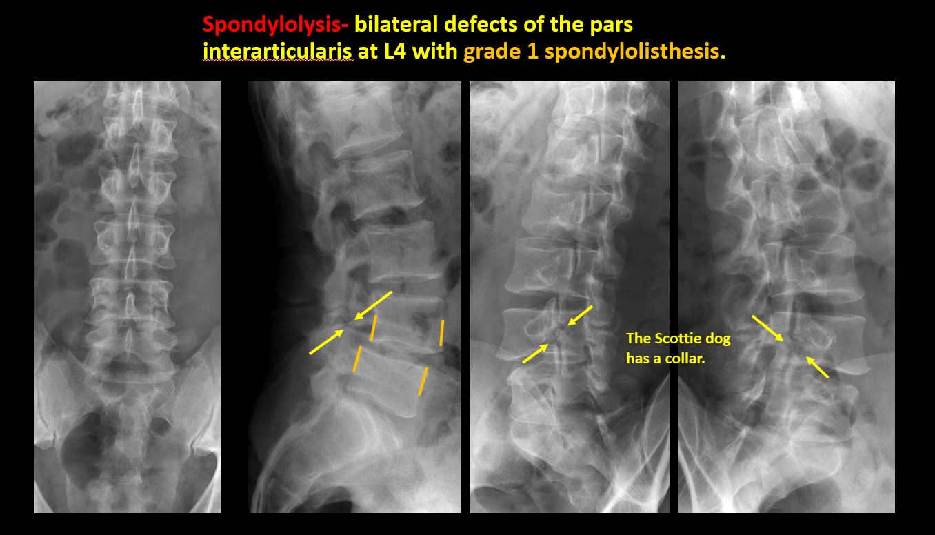 There is lucency or defect of the pars interarticularis from spondylolysis. |