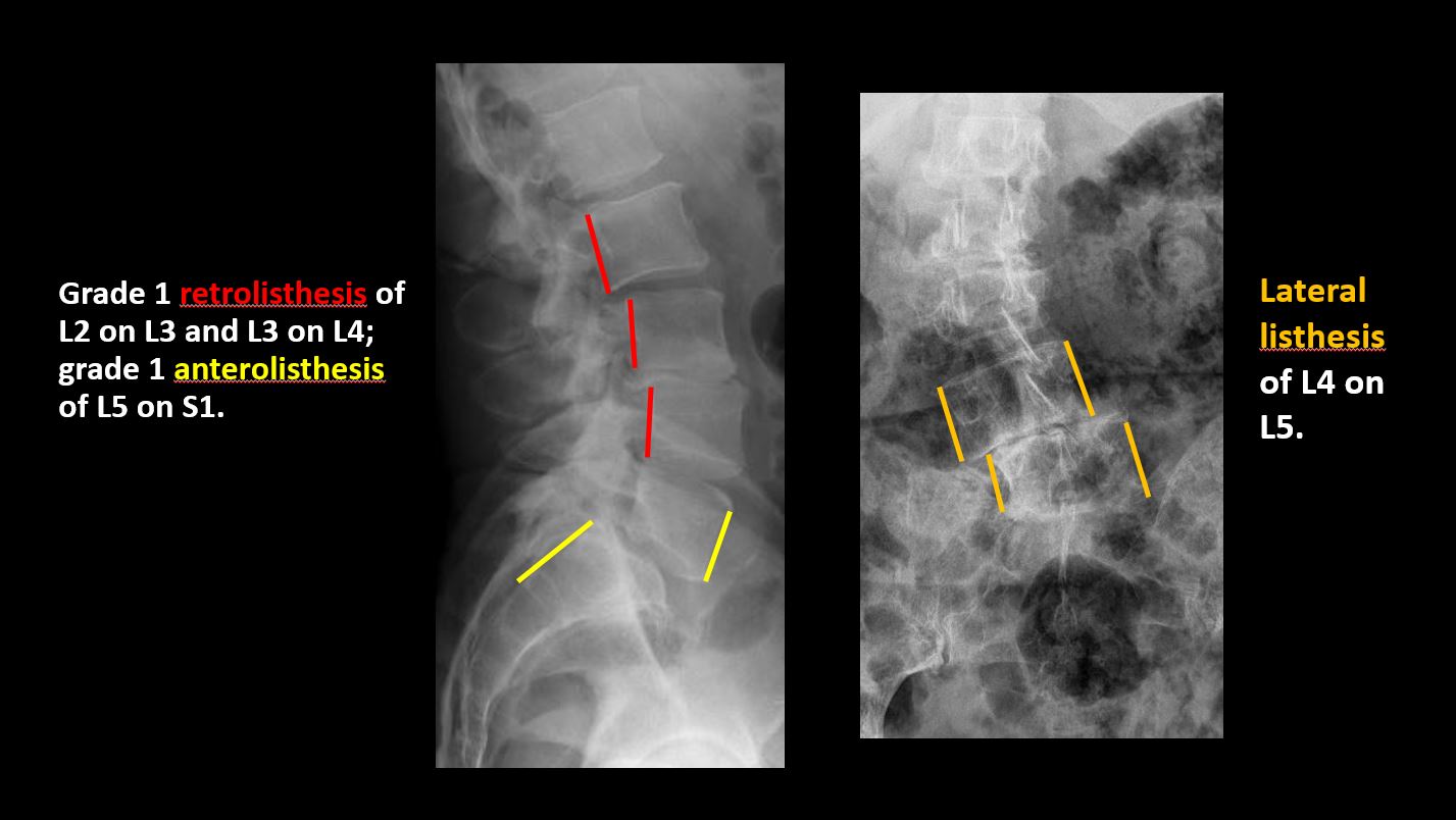 There is anterior or posterior spondylolisthesis, subluxation, or rotational abnormality at a disc space. |