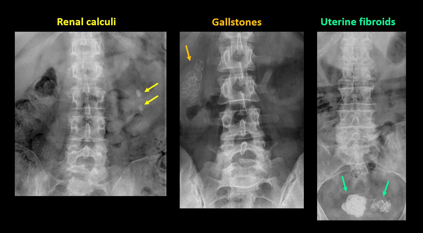 There are gallstones, vascular, renal, pelvic, or other soft tissue calcifications present. |