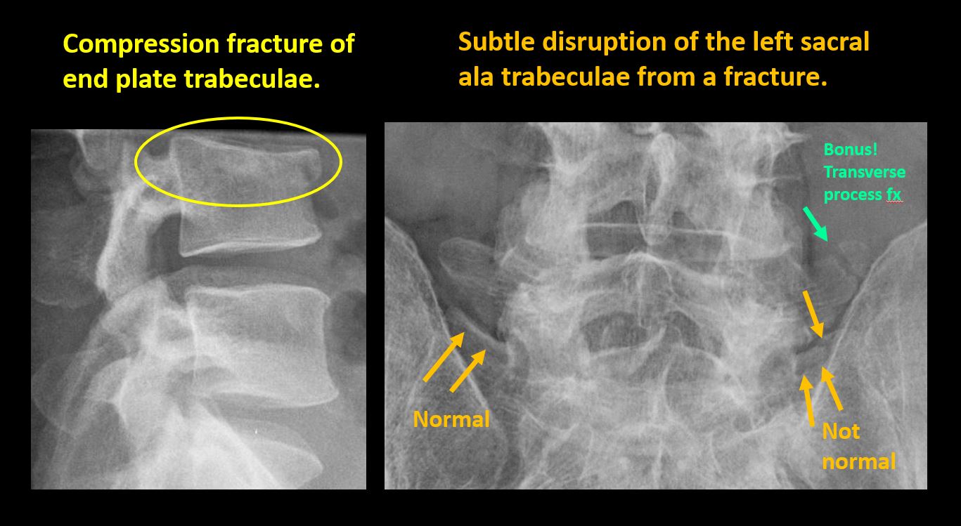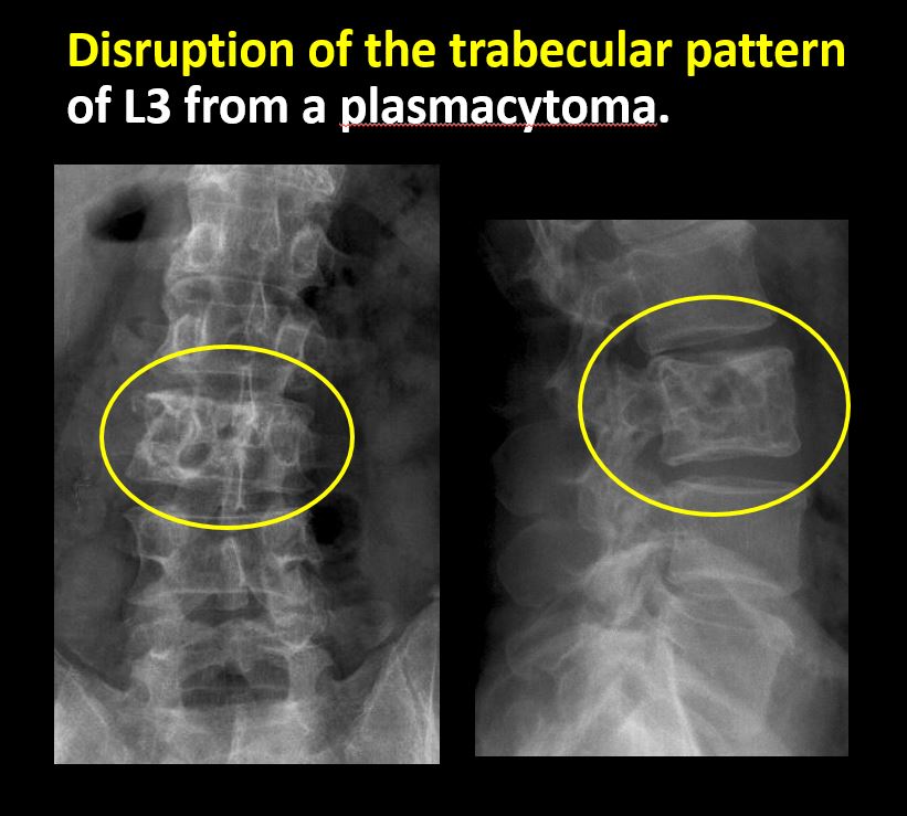 There is evidence of a lytic or sclerotic lesion, or disruption of the trabecular pattern of a vertebral body, end plate, or sacrum. |