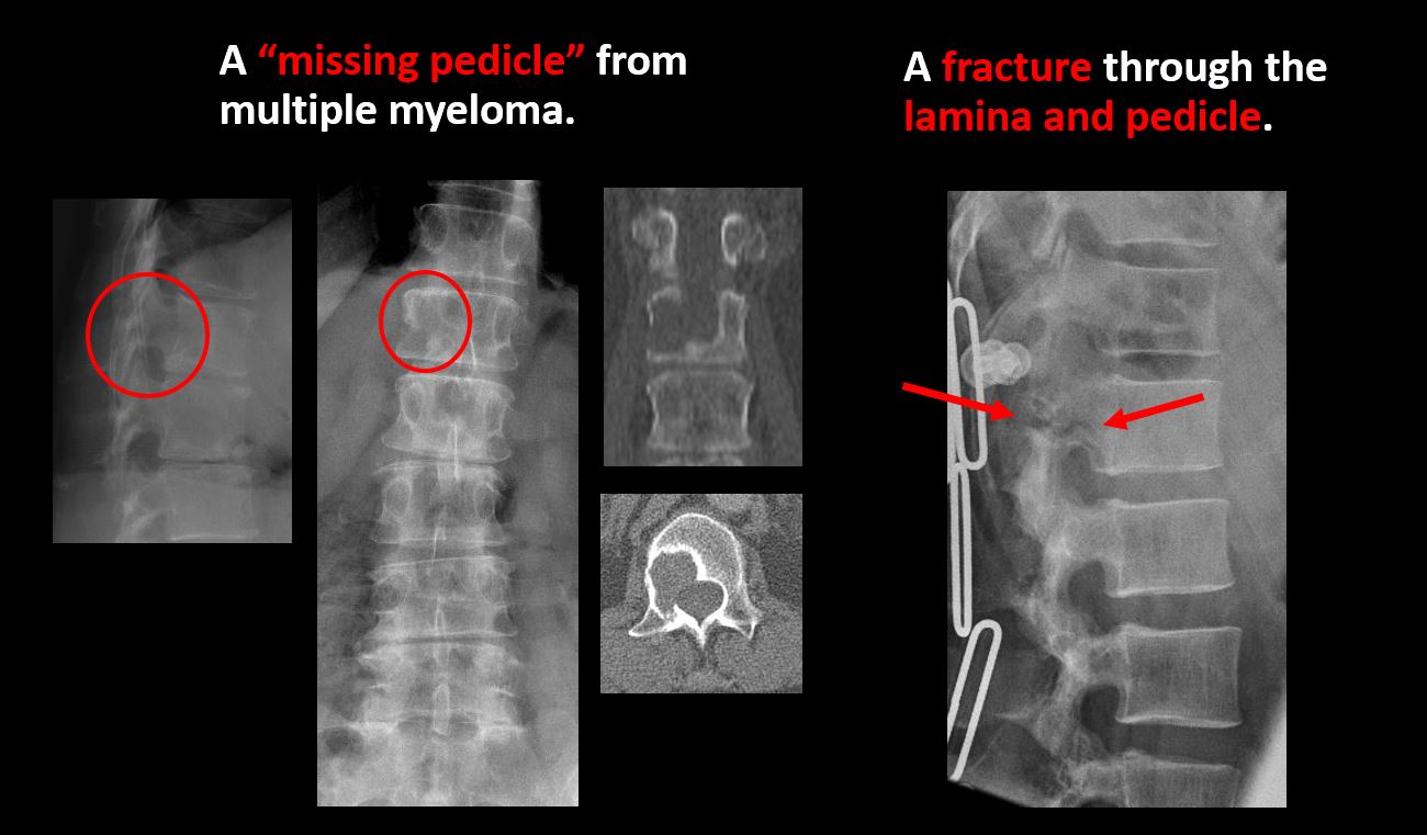 There is an abnormality of a pedicle or lamina on the frontal or lateral view. |