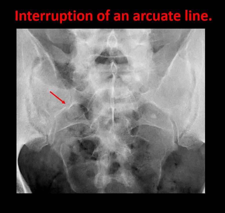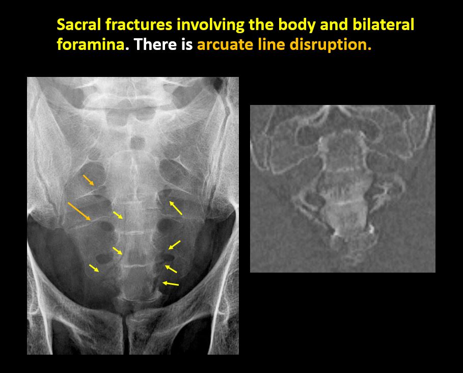 There is a fracture or interruption of the arcuate lines of the sacrum. |