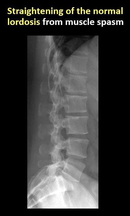 There is reversal or straightening of the normal lordosis or scoliosis of the lumbar spine. |