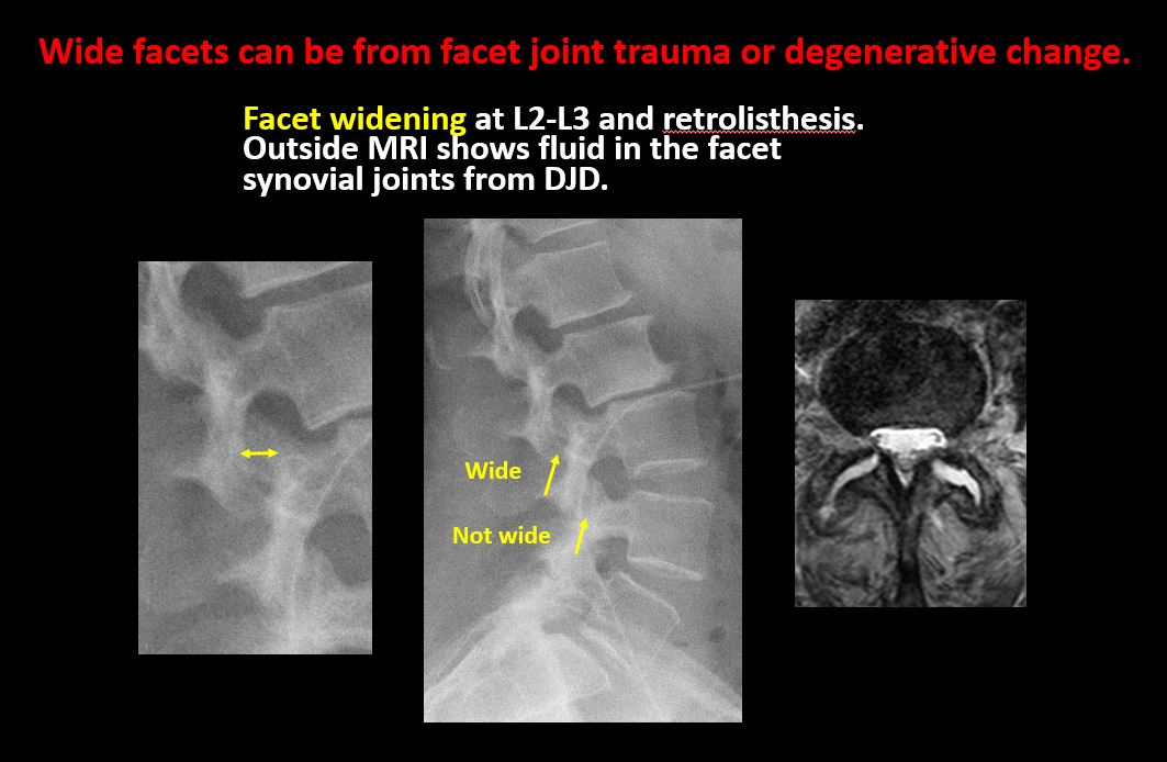 There is widening, rotational abnormality, or displacement of facets at any motion segment. |