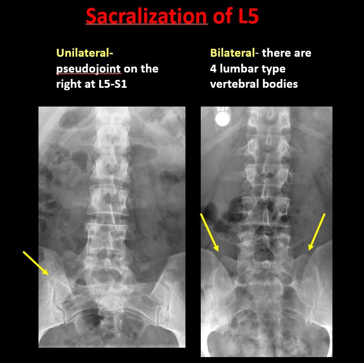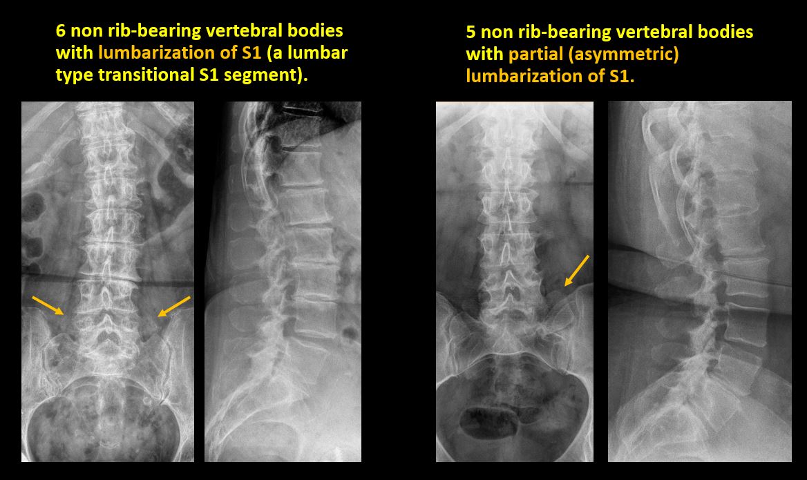 There is a transitional motion segment at the lumbosacral junction (sacralization of L5 or lumbarization of S1). |
