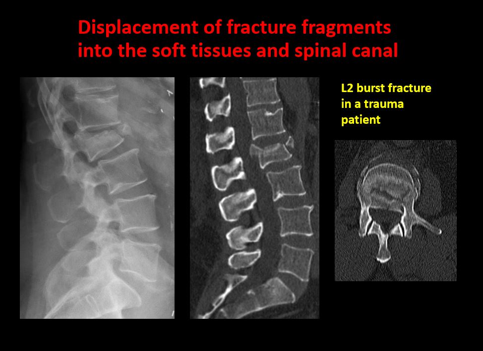 There is displacement of a fracture fragment into the soft tissues or spinal canal. |