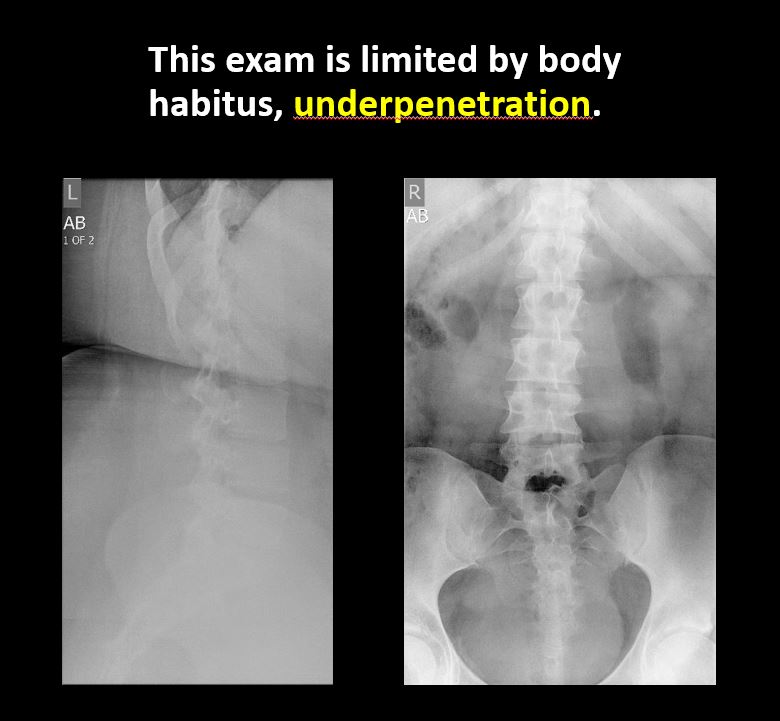 The exam is limited by overlying structures, bones or soft tissues, patient positioning, support devices, or motion. |