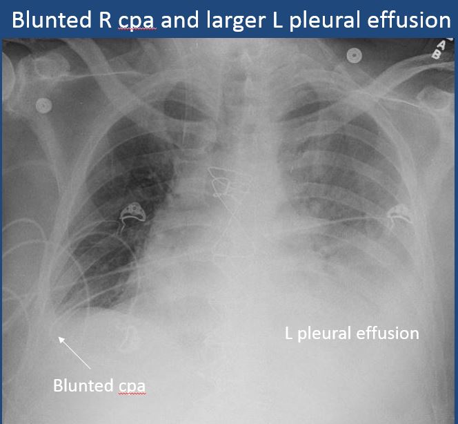 There is a pleural effusion or blunting of the costophrenic angle. |