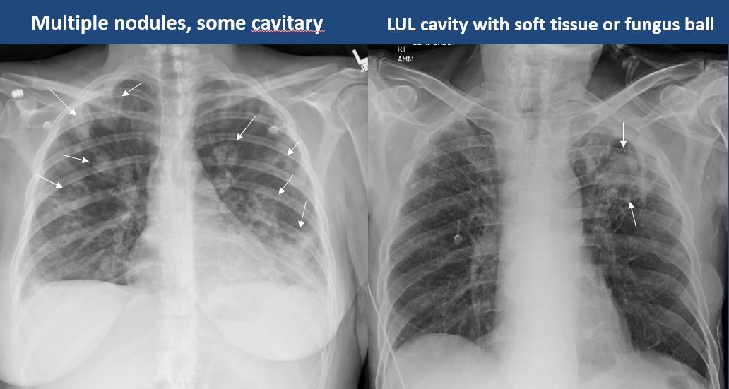 There is cavitary or cystic disease with or without air fluid levels or soft tissue nodularity. |