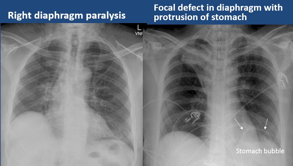 The right or left hemidiaphragm is focally or diffusely obscured. |
