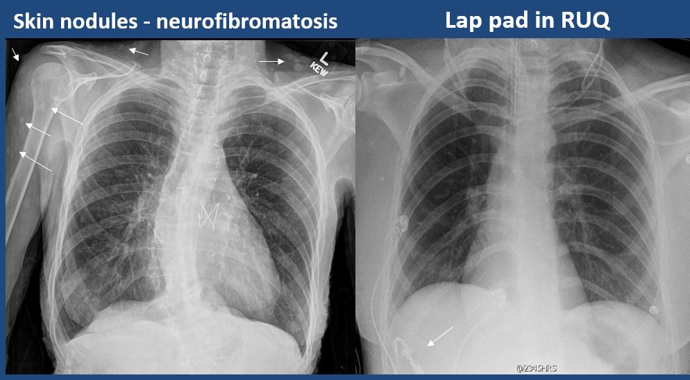 There is subcutaneous emphysema, focal or diffuse soft tissue abnormality, radiopaque foreign body, or post-surgical change or hardware. |