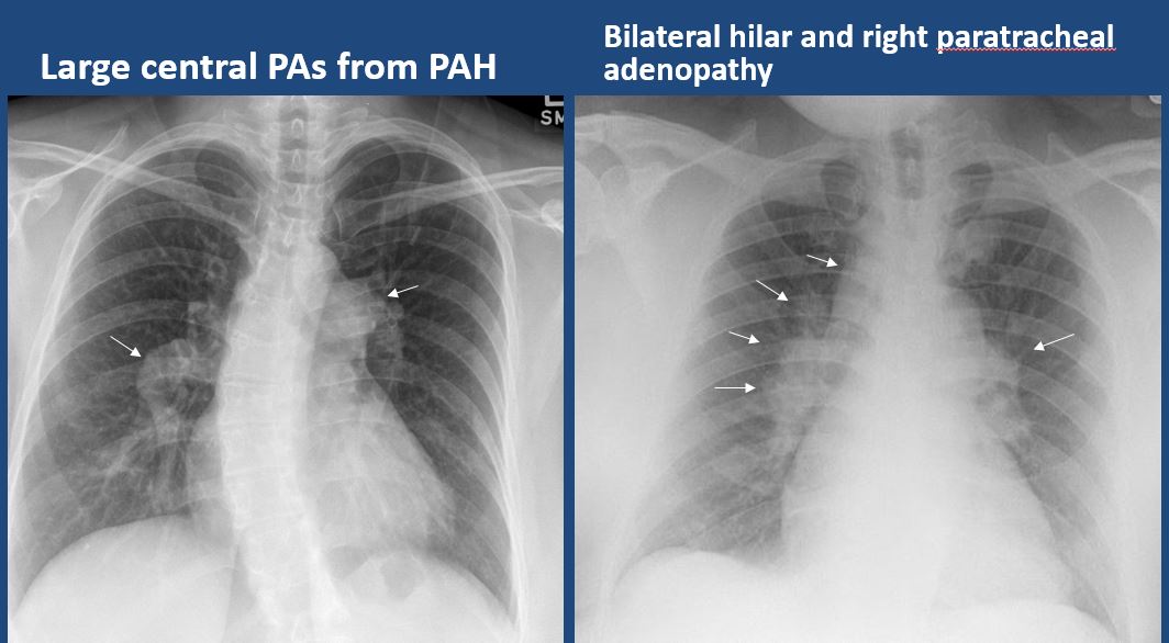 The central pulmonary arteries or hila are enlarged. |